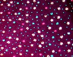こちらが生地。 (柄がとても小さくて近づいたらボケてしまった) ボルドー地に発泡した小花がとんでいます。 ユザワヤに寄った際に特価品をみつけました。 柄があるとヘタクソな縫い目が隠れて私向き! という事を、作り終わってから実感しました。 着用すると こんな感じ。