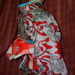 ![]() (右:sakkoさん) (お店の可愛いこちゃん2人、花ちゃん) 本日のこしらえ、差し色がポイントです。着物・帯・履物はオレンジ系にし、半衿と帯揚げだけブルーに。本当はもっと濃いめのブルーなんですが写真では色が出ません。 帯は珍しく半幅。ざっくりとした風合いの単帯です。キュッと結んで…。 半衿には赤い糸で刺し子刺繍をしました。フリーハンドの下書きのため左右対称になっていません。お手製だもの、それで充分さ。