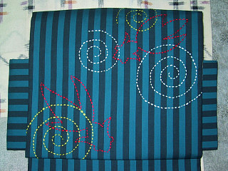 次の作り帯はこれ!と決めていました。 金魚モチーフの刺し子。 アンティーク帯には金魚が刺繍された素敵なものを見かけますよね。私も夏の金魚帯が1つは欲しい。それも普段着っぽいカジュアルな金魚柄が欲しいナと思っていたのです。 で、作りました! 青系の縞は川の流れをイメージして選んでみました。写真では赤い金魚があまり目立ちませんが実物はもう少し鮮やかさがあります。白っぽい地色のほうが刺し子は映えそうですが今回はベージュ地の着物に合わせたかったので濃い色を選択。