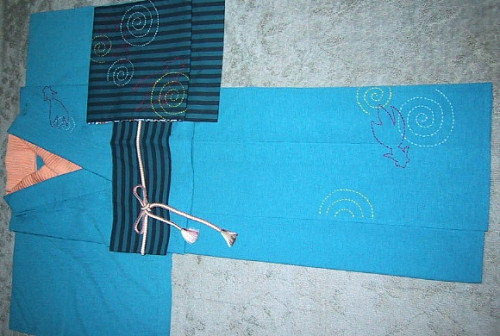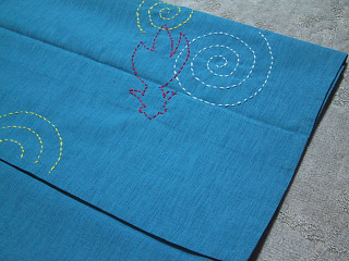 ある時、リサイクルショップでターコイズブルー系の無地キモノを見つけました。何もない無地、今までなら目は素通りしてたはず。しかし色は珍しい鮮やな青で綺麗!ずっと見てたら頭ん中にポッと電球がつきました。 あっ、刺し子するにはもってこいじゃん♪ 調子こいて、キモノにまで刺し子しちゃいました。 ぐるぐる金魚 また登場。 着物と帯が同じ柄なんてヒネリがなくて面白くない?(地色も同系の青だしな〜)、さらに柄が同じでクドイかもと思いつつも、「全く同じ柄」で揃えるなんてなかなか出来ないんだから、それもいいかと…。 くどかったら違う帯と合わせればいいだけだ。 刺し子は前裾と胸上あたりの2箇所にさしました。帯のぐるぐる金魚は後側にくるので着物は全て前側に。だから着てしまうと全然しつこくありません。同系色ということもあって私にはスッキリしすぎ。半衿にオレンジなど赤い色味がないとかえって寂しいくらいです。 ![]() 次の刺し子は帯。9月中旬のお出掛けに向けて作成開始しました。期日があるから頑張ります。 私のカジュアル路線にはこってり刺繍より刺し子が似合う気がします。 この刺し子熱はしばらく下がりそうもありません。 ただ、伝統的な文様を繰り返す刺し子 とは違う。特に藍地に白糸というのが一番違います。 それは好きな刺し子ではありません。 やりたいのは帯というキャンバスにカラフルな色で好きな模様を描くこと。刺し子だから線画になってしまうけど、運針という簡単な手法で手軽に出来るできるのがいいのです。 |