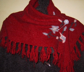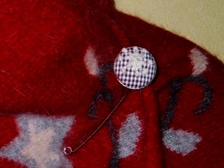 さらにもう1つ、この赤いショールに合うピンも作りました。 茶ギンガムチェックにページュの毛糸で、花のような?雪の結晶のような?刺繍をしました。 シンプルめで暖かい雰囲気を出したかったの。