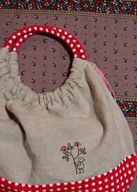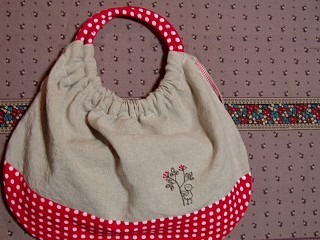 もう1つのポイントは持ち手。 下の切り替え布(手ぬぐい)とお揃い。 元は茶色の木の持ち手だったのですが、赤い手ぬぐいを巻きました。 上にも赤い色がないと下の赤ばかり目立ってしまうんです。 このバックの一番の勝因は、赤い持ち手にしたことかも。 食欲の秋、読書の秋、チクチクの秋、です! 是非、みなさまも〜。 |
