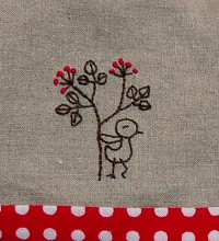 今まで刺していたものと比べると、すごく小さくて(5センチ四方くらい)、図案を写すのが大変でした。 小さいものは細い線で綺麗に下書きしてないといびつになりやすいのです。 いえ、いつも充分いびつか、何をいまさら…(笑) このユーモラスな小鳥くん、いかがでしょう。 足にご注目。木に寄りかかって「休め」の体勢とっているんですよ。 自分で作った贔屓目で、ナマで見るともっとかわいいんですけど。テヘ。
