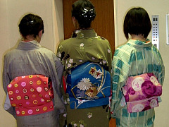 右:冬桃さんは、新潟旅行でみつけた200円(←自慢(笑))の繻子帯。初めて角だしに挑戦。