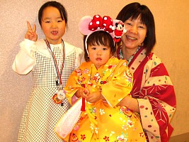 2001年に葵衣ちゃんが3歳の七五三をしたかと思ったら、 今年はもう7歳で(当たり前!)、下には妹:名菜ちゃんができ今年3歳だと。 あぁ〜月日が経つのは早い、早すぎる。もう4年も経っちゃったの? で今年はダブルの七五三。 好きな着物&ドレスが選べる子供専用の写真館で記念撮影するという。 冬桃ねぇちゃんもウキウキと出掛けていきましたよ。 館内ではカメラ禁止だったのでドレスアップした写真は撮れませんでしたが、 それはそれは可愛い写真に仕上がっていました。