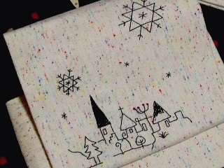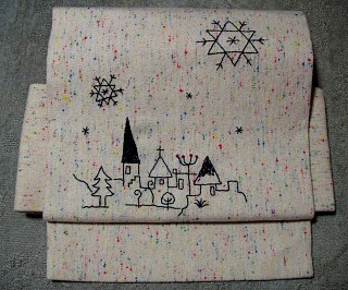 少し起毛している ふんわり生地に 冬景色をステッチ。 カラフルな色が織り込んであるので、生地だけ見ると甘い可愛い感じがします。 そこに黒のみで刺繍したら、ぐっと引き締まりました! 実はこの帯はN様への贈り物として作成。 長い時間がかかってしまいましたが、約束を果たせてホッとしています。