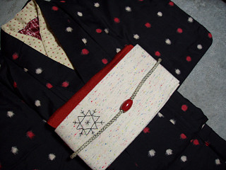 半幅には大きな雪の結晶をワンポイント。 お正月に着たキモノにのせてみました。 生成り地に黒ステッチなので、何にでも合いそう。 図案はN様のご友人のコラージュ作品から了解を得て使わせていただいたもの。 N様もそれがお気に入りの様子でしたので図案決定と相成りました。この帯はまさにN様のためのものですわ。