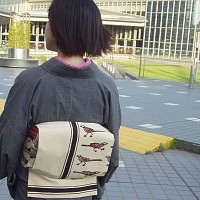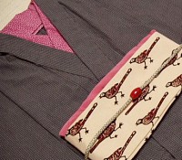 珍しく、と言うか、初めてではないでしょうか。こんなに着物が渋いのは。着物単品で見ると男物か?と思えるほど渋いんですが、帯が映えます、映えます。 素材は伊勢木綿。手触りがよくて着心地サイコー。 半衿と帯揚げと下駄をピンクにして差し色に。