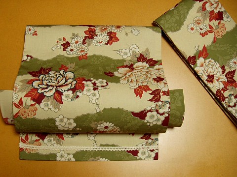 手作りの波に乗り、もう1つ、出来てしまいました。 いつか帯にしようと買ってた生地で、裏地も芯も綾テープも全部用意済みだったやつ。 いろいろ出てきた後に「あぁ〜全て揃えてたんだっけ!」と思い出しました。 手作り派の皆様も、今このページを見たのがチャンス、材料収納BOXを覗いてみましょね〜。 忘れていたものと出会えるかも。 ![]() 形はいつものお太鼓形ではなくて、つの出し風になるようにしてみました。 てか、手先部分をくっつけなかった、だけなんですけど(^_^;) それと、 なにか加えたくて左の花だけ縁取り刺繍してみました。 日本刺繍だったらもっと豪華で素敵なんでしょうけれど、 私の技量ではアウトラインステッチ&バックステッチです。