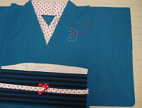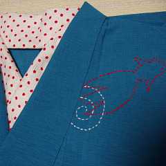 ![]() 半襟は、リップル地の水玉生地を使い、 帯は、もちろん自作で ぐるぐる金魚 の刺し子をし、