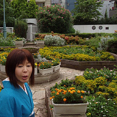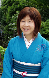 ![]() 帯締めは、半襟と同じ生地で自作し、 帯留めは、ハート型に切り抜いた厚紙に布を貼っただけの愛すべきチープ品で、 帯揚げは、ドット柄の2重ガーゼ生地を使用。 着物と帯は前に(手作りのページで)紹介していますが、着たのは初めてなので〜す♪