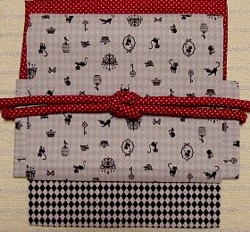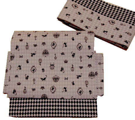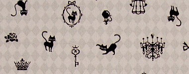 柄のアップ。 猫のほかに、鍵とか王冠とかシャンデリアとか小鳥とか、います。 うっすら透けているダイヤ柄はこの生地自体の裏柄。両面に柄のある生地なんです。