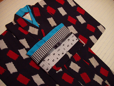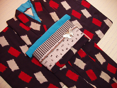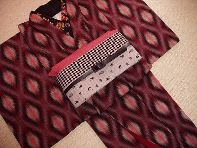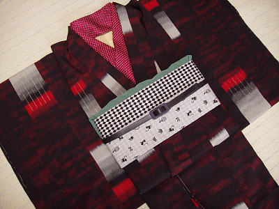 お太鼓の裏は赤地に白ドット。 モノトーンの効かせ色はやっぱ赤でしょ。 その裏地と同じ生地で 丸ぐけや帯揚げ・半襟も作りました。 もちろん、 それ全部つけたらクドイです! この帯を"クールで可愛い大人カジュアル"にするためにイメージしたキモノは、やはりモノトーン。 左:白黒なキモノに赤い小物でキュートに。 右:帯締めを黒ベルトにして、青緑の半襟がポイント、カッコイイぞよ。