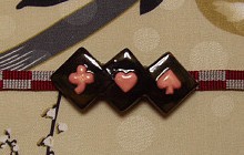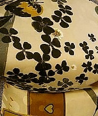 帯は今モノ。最近ゲットした おニュ〜。 カードやリンゴ、四つ葉のクローバー、すずらん、星など、いろいろ描かれています。 水玉の地紋もポイント。